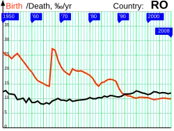 Diese geburtenfördernden Maßnahmen hatten einen gewissen Erfolg, denn in den späten 1960er Jahren kam es zu einem Babyboom, wobei die 1967 und 1968 geborenen Generationen die größten in der Geschichte des Landes waren. Die geburtenfördernden Maßnahmen ließen die Geburtenraten einige Jahre lang vorübergehend ansteigen, doch danach ging die Zahl der Geburten aufgrund der zunehmenden Nutzung illegaler Abtreibungen zurück.[25][26] Ceaușescus Politik führte zum Tod von über 9.000 Frauen aufgrund illegaler Abtreibungen,[27] Eine große Anzahl von Kindern, wurden in rumänische Waisenhäuser gesteckt, vor allem diejenigen von Eltern, die mit der Erziehung überfordert waren. Sie wurden häufig zu Straßenkindern der 1990er Jahre (als viele Waisenhäuser geschlossen wurden und die Kinder auf der Straße landeten), was zu katastrophaler Überbelegung von Heimen und Schulen führte.
