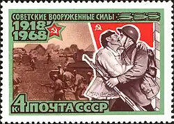 Zu Berühmtheit gelangte der Bruderkuss durch den Fotografen Régis Bossu, welcher im Oktober 1979 Erich Honecker (DDR) und Leonid Breschnew (Sowjetunion)[7] nach einer Rede anlässlich des 30. Jahrestages der DDR ablichtete. Auf Grundlage dieses Bildes entstand später das bekannte Bruderkussgemälde an der East Side Gallery.[8]