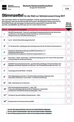- ↑ Wahlkalender 2017 für die Wahlen zu den Vertreterversammlungen in der Renten- und Unfallversicherung und zu Verwaltungsräten in der Krankenversicherung. (PDF; 45,3 kB) bmas.de; abgerufen am 15. Januar 2017