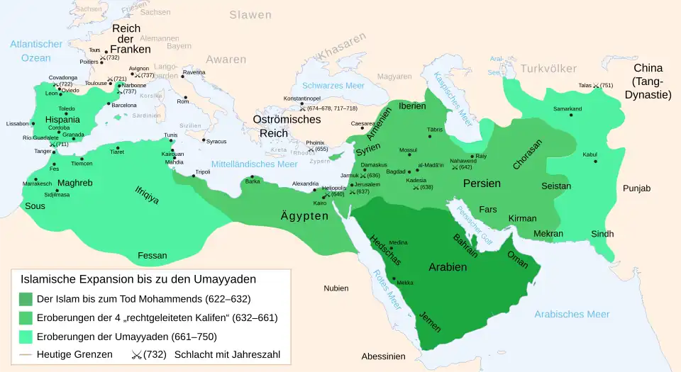 - 632: Tod Mohammeds und Beginn der islamischen Expansion, die durch die Erschöpfung Ostroms und Persiens erheblich begünstigt wird.