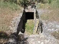 Die Grabstätten wurden hauptsächlich in Ost-West-Richtung ausgerichtet.[9] Sie sind unterschiedlicher Größe, bei den beiden größten Grabkammern arbeiteten die Erbauer einen mittleren beziehungsweise zwei an den Wänden befindliche Pfeiler aus dem Fels heraus, um die Kammerdecken zu stützen. Das größte der Gräber befindet sich am Südende des umzäunten Geländes. Es besitzt einen Dromos von 16 Metern Länge und eine quadratische Grabkammer mit 5 Metern Seitenlänge. Das Grab unterscheidet sich von anderen durch eine umlaufende, aus dem Fels herausgearbeitete Steinbank.[7]