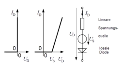Vom Modell einer rein passiv betriebenen Spannungsquelle wird im gezeigten Ersatzschaltbild einer Diode Gebrauch gemacht. Mit diesem wird das mathematisch schwer handhabbare nichtlineare Diodenverhalten durch ein abschnittsweise lineares Verhalten angenähert.[11][12][13] Die Spannungsquelle existiert nicht real, aber im Modell liefert sie passiv wirkend die Schleusenspannung , so dass die Diode nur bei leitet. Aufgrund ihres Verhaltens ist die Spannungsquelle gemäß dem Verbraucherzählpfeilsystem beschriftet.– Die aktive Quelle, die den Diodenstrom liefert, ist in der äußeren Beschaltung der Diode enthalten, also im Diodenmodell nicht zu finden.