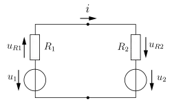 Bei einem Verbund zweier linearer Spannungsquellen wie im nächsten Bild ist für die linke das Erzeuger- und die rechte das Verbraucherzählpfeilsystem angesetzt. Die linke gibt bei mit Energie an die rechte ab. Bei kehrt sich die Energierichtung mit um.