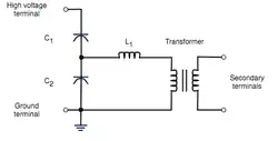 Insbesondere im Bereich von Hoch- und Höchstspannungen über 100 kV kommen kapazitive Spannungswandler zur Anwendung. Der Grund liegt darin, dass die Isolationsfestigkeit bei hohen Spannungen sich nur mit großem Aufwand im Transformator bzw. hohen Kosten sicherstellen lässt. Daher wird, wie in nebenstehender Schaltung dargestellt, ein kapazitiver Spannungsteiler auf der Hochspannungsseite vorgesehen. Der in der Schaltung eingezeichnete hochspannungsfeste Kondensator C1 ist im Inneren des Isolationskörpers untergebracht und mit der zu messenden Spannung Up verbunden. Dieser Kondensator kann auch aus einer Reihenschaltung mehrerer einzelner Kondensatoren bestehen, um die Spannungsfestigkeit der gesamten Anordnung zu erhöhen. C2 kann auch außerhalb des Wandlerkörpers untergebracht werden.