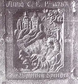 Alle Speicher hatten Namen und oft schöne, von Steinmetzen gefertigte Speichermarken: Pelikan (1670), Schäferspeicher (1717), Greif (1728), Hirsch (1741), Großer Friedrich, Pax (1777), Walfisch, Kasten Noä, Weintraubenspeicher und andere. Friedrich Saturgus und sein Bruder besaßen 20 Speicher. Südlich des Pregels baute Friedrich Schwink den Schwan (1670), Storch und Kranich.[1]