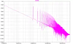 - Im Bild rechts ist ein MSS der Funktion mit einem gleichverteilten Rauschprozess (Quantisierungsrauschen) bei einer Abtastrate von 44.100 Hz und einer Auflösebandbreite von BW = 43,1 Hz (resultierend aus 44100 Hz / 1024 FFT-Punkte) zu sehen, wie es beispielsweise von einer CD kommen könnte. Die Spitze bei etwa −3 dB repräsentiert das Sinussignal auf dem Rauschgrund bei etwa −128 dB. Da die Leistungsangaben sich auf die Auflösebandbreite beziehen, kann man das SNR zu ablesen (beachte das Logarithmusgesetz, das Multiplikationen in Additionen transformiert). Das aus dem Bild abgelesene SNR kommt damit dem theoretisch erwarteten von recht nahe.