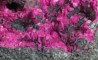 | Farbe | Aggregate: pfirsichblütenfarben, außen samtschwarz[4]; auch tief rosarot, dunkel magentarot, rot, an der Oberfläche oft grau, braun oder schwarz[6] Kristalle: hellrosa bis dunkel rosaviolett, violettrot[11][12] |