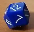 W10 pentagonales Trapezoeder Ja Körper aus zehn Drachenvierecken (als einziger der gängigen Würfel kein platonischer Körper). Üblicherweise wird er mit den Zahlen 0–9 beschriftet, wobei die 0 oft als 10 gewertet wird. Ohne diese Umwertung ist die Summe der Zahlen auf je zwei gegenüberliegenden Seiten 9. Es gibt selten Versionen mit den Zahlen 1–10, in dem Fall ergeben die Zahlen auf je zwei gegenüberliegenden Seiten die Summe 11. Mit anderer Beschriftung wird dieser Würfel als Zehnerstellenwürfel beim W100 genutzt (s. u.).