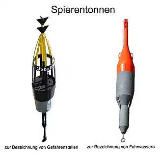 - ↑ in vielen Fällen werden die Gefahrenstellen nicht von vier Tonnen für alle vier Himmelsrichtungen, sondern lediglich durch eine einzige Spierentonne gekennzeichnet