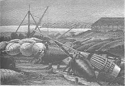 Anfang bis Mitte des 19. Jahrhunderts wurden Spierentonnen aus Holz gebaut[3], die aus einem vom Böttcher modifizierten Holzfass in Form einer kegelförmigen Stumpftonne bestanden, das am unteren Ende spitz zulief und oben mit einem Deckel versehen war. In die Deckelmitte wurde eine Aussparung eingebracht, in die dann eine Holzstange – die Spiere – eingefügt wurde. Sie ragte etwa 50 cm aus dem unteren Ende der Tonne heraus und wurde hier mit einem ringförmigen Beschlag versehen, an dem schließlich die Kette und ein Naturstein angebracht wurden, so dass eine Verankerung am Gewässer- oder Meeresboden möglich war. Die Spiere ragte dabei je nach Modell nach oben etwa 3 bis 4 Meter aus dem Tonnendeckel heraus.