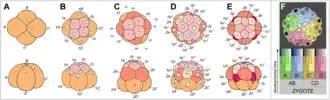 Die befruchtete Eizelle teilt sich zunächst zweimal meridional, die Teilungfurchen laufen dabei von einem Pol zum anderen. Dabei entstehen vier Zellen, die in einer Ebene liegen (Phase A des Taxobilds). Bei der zweiten Teilung entstehen vier Zellen, A, B, C, D. Die dritte Teilung findet äquatorial statt. Dabei entstehen zwei Ebenen mit jeweils vier Zellen, vier größere Blastomeren, die Makromeren (1A - 1D) und vier kleinere Zellen, die Mikromeren (1a - 1d) (Phase B des Taxobilds). Die Mikromeren liegen jeweils in den Furchen zwischen zwei Makromeren und sind gegenüber diesen um 45° verdreht. Die vier Makromeren teilen sich wieder und bilden eine zweite Gruppe von vier Mikromeren (Phase C des Taxobilds). Auch die Mikromeren teilen sich, so dass die Eizelle nach vier Teilungen aus 16 Zellen besteht (Phase D des Taxobilds).
