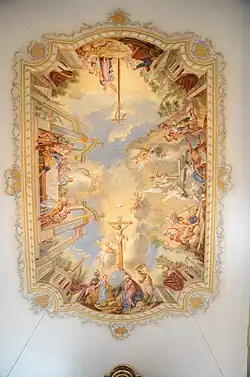 Das Deckenfresko im Langhaus, kunsthistorisch und für süddeutsche evangelische Kirchen eine Rarität, wurde im September und Oktober 1774 von Johann Nepomuk Nieberlein (1729 – 1805) aus Ellwangen ausgeführt. Sein Hauptwerk verbindet das Rokoko und dessen Gegenstil, den Klassizismus. Zwar verweigerte der evangelische Magistrat zunächst seine Zustimmung, weil man davon „in Evangelischen Kirchen gänzlich abgekommen“ sei, man wollte es „nur mit einigen leichten Muscheln von Stuckatur-Arbeit ausgeziert“ haben. Doch das Bildprogramm wurde ikonologisch meisterhaft im Sinn der Kirchenpflege umgesetzt.