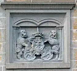Über dem Scheitel des östlichen und somit äusseren Torbogens befindet sich ein in Sandstein gemeisseltes Wappenrelief. Dieses war ursprünglich farbig eingefasst und zeigt neben der Jahreszahl 1556 mit den Initialen H·S·B ein im Renaissancestil gehaltene Wappentriade des Bremgarten-Reiches. Diese Wappentriade ist wappengekrönt und wird von beidseitig von ins Groteske-Skurrile gesteigerten Schildhalterlöwen gehalten. Diese wiederum sind von einer stichbogenförmigen Zwillingsarkade mit zierlichen Balustraden umgeben. Das gesamte Wappenrelief befindet sich in einer kräftigen gekehlten, quadratischen Umrandung mit Abdeckplatte.
