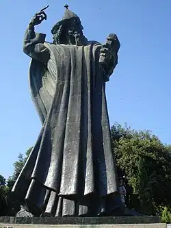 - Glockenturm des ehem. Benediktinerinnenklosters des hl. Arnir neben der Skulptur des Gregor von Nin