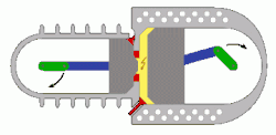Als Variante gibt es einen dreizylindrigen Motor bei dem zwei kleine Kolben die Gasvorverdichtung übernehmen und einen zentralen großen Kolben antreiben.