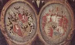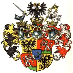 - Das freiherrliche Wappen von 1647 ist geviert und belegt mit einem blauen Herzschild, darin ein aus einer silbernen Wolke am rechten unteren Schildrand hervorwachsender gewinkelter silberner Schwertarm; Feld 1 und 4 in Gold ein goldengekrönter und -bewehrter schwarzer Doppeladler, 2 und 3 in Rot auf grünem Dreiberg einwärts gekehrt ein goldengekrönter doppelschwänziger silberner Löwe, mit den Vorderpranken eine goldene Lanze mit von Gold und Schwarz gevierter Flagge haltend; auf dem Schild drei Helme, auf dem ersten mit schwarz-goldenen Decken der gewinkelte, mit dem Ellenbogen auf die Helmkrone aufgestützter Schwertarm, auf dem mittleren Helm mit rechts schwarz-goldenen, links rot-silbernen Decken der Doppeladler, ein goldenes Schildchen mit Kaisermonogramm auf der Brust, auf dem linken Helm mit rot-silbernen Decken der Löwe des Schildes wachsend, die Lanze mit der von Gold und Schwarz gevierten Flagge.