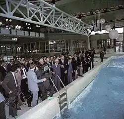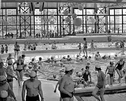 - ein Schwimm- und Spaßbad mit sieben teils ineinander-laufenden Becken mit Wasserfall (inklusive einer Saunalandschaft, einem Wellenbad, einem Sprungturmbecken, einem Kaskadenbecken, einem 400 m² großen erwärmbaren Außenbecken und integrierten Bräunungsebenen). Letztere waren etwas problematisch, da es auf diesen abgelegeneren Inseln, die an einer Treppe auf verschiedenen Ebenen lagen, auch häufiger zu einvernehmlichen sexuellen Kontakten kam. Ein großes Außenbad mit Wasserrutsche war von innen her, durch eine Unterführung bzw. eine ca. 2 cm Gummiwand erreichbar, durch die man tauchen musste.