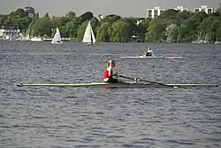 Nachdem Pferderennsport etablierte sich Rudern als erste Sportart. 1836 wurde Der Hamburger Ruder Club, 1853 der Germania Ruder-Club,[52] 1854 der Ruder-Club Favorite Hammonia und 1866 der Ruder-Club „Allemannia von 1866“ gegründet. Nur in England gab es ältere Rudervereine. Im Landesruderverband Hamburg sind heute über 20 Vereine als Mitglieder organisiert.[53] Nach den Ruderern eroberten die Segler die Alster als ihr Revier und gründeten 1868 den Norddeutschen Regatta Verein. Als weiteres Segelrevier dient heute die Elbe. Der Hamburger Seglerverband e. V. ist die Interessenvertretung.[54]
