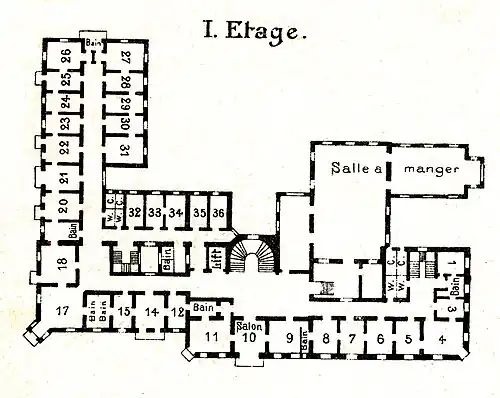 Restaurant und Bar im Altbau blieben unverändert. An die Stelle des ehemaligen Empfangsbereichs des Hotels trat ein Ladengeschäft, im Grundriss als Bank bezeichnet, das verschiedentlich umgebaut wurde.[16] Die Erweiterung des Hotels erforderte einen grösseren Speisesaal (Salle à manger). Der Anbau eines neuen Ökonomiegebäudes südlich an den bestehenden Trakt vergrösserte seine Fläche rund um die Hälfte. Zwei ehemalige Rundbogenfenster des alten Speisesaals verbanden als Durchgänge die beiden Saalteile. Die Zimmeraufteilung im neuen Flügel war von der ersten bis zur dritten Etage weitgehend identisch. Die Zimmer reihten sich entlang eines Mittelganges, der sich im vorderen Bereich des Hotels teilte und den Lichthof, ein Etagenbad und das Nebentreppenhaus umschloss. Individuelle Badezimmer waren auch in den 1890er Jahren noch nicht die Regel. Die gesteigerten Ansprüche definierte die Neuauflage des Handbuchs der Architektur 1894 mit ein Badezimmer für je 20 bis 30 Betten und auf je 8 Betten ein Abort.[17] Der Neubau erhielt als Ausdruck des gesteigerten Komforts auf jeder Etage sechs Bäder (im Grundriss Bain). Durch mehrere Verbindungstüren liessen sich diese einem der angrenzenden Zimmer zuteilen oder durch die Tür zum Gang als Gemeinschaftsbad nutzen.