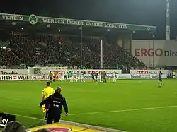 - Gegengerade: Die Gegengerade wurde ebenfalls im Jahr 1997 an Stelle der alten Gegengerade mit den legendären Pappeln errichtet, wobei jene dem Umbau zum Opfer fielen. Sie ist eine reine Sitzplatztribüne, bietet circa 2.500 Menschen Platz und ist die niedrigste Tribüne des Stadions. Seit 2018 befindet sich dahinter ein Biergarten. Zusätzlich wurde der Familienblock von der Südtribüne auf den an die Nordtribüne angrenzenden Bereich der Gegengerade verlagert.[15]