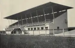 | Tribüne des Sportplatz Schartens im Jahr 1950 | ||