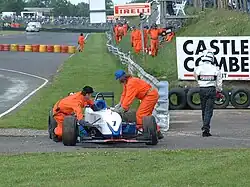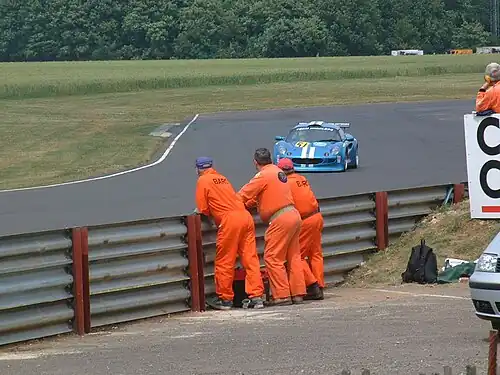 Der Sportwart an der Strecke, ist für die direkte Absicherung und Überwachung an der Rennstrecke zuständig. Er sichert Unfallstellen vom Streckenposten aus durch Flaggenzeichen ab, meldet Unfälle oder Regelverstöße an die Rennleitung und hilft in Gefahrensituationen, bei der Feuerbekämpfung und bei der Bergung von Fahrzeugen und Fahrern.[4] Er ist meistens auch für die Überwachung der Streckenbeschaffenheit seines Abschnitts verantwortlich und reinigt in den Rennpausen mit Abstreumittel und Besen die Strecke.