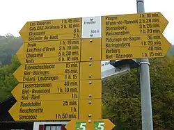Dieser Wegweiser im Berner Jura steht zwar im frankophonen Sprachgebiet; die angezeigten Wege führen aber an Ziele beidseits der Sprachgrenze.