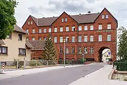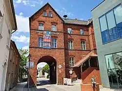 Im Torbogen hängt der linke Unterkieferknochen eines Grönlandwals. Der Knochen stammt aus dem 18. Jahrhundert und ist ein Geschenk des Hamburger Kaufmanns Morzan-Schimkönig an seine Geburtsstadt Lübbenau.