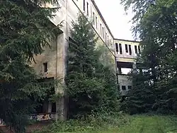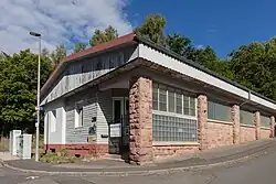 - Lager Vereinshaus (auch Lager Süd), ursprünglich für bis zu 700 Personen konzipiertes Lager mit 23 Gebäuden, hauptsächlich Holzbaracken.[40][41] Das Lager war ursprünglich zur Unterbringung von Bauarbeitern angelegt. Später wurde es mit französischen Werksarbeitern neben den deutschen und ausländischen Bauarbeitern belegt. Im Sommer 1944 wurde ein Teil des Lagers abgetrennt und mit Stacheldraht umzäunt. Ab Anfang August 1944 bildete dieser Teil des Lagers ein Außenlager des KZ Buchenwald, in das zwischen 790 und 1.000 hauptsächlich jüdische Frauen aus Ungarn gepfercht wurden. Diese waren zuvor im KZ Auschwitz selektiert worden. In den Nachkriegsjahren dienten die Baracken verschiedenen Zwecken. In einem Teil befanden sich noch bis in die 1950er Jahre Unterrichtsräume des städtischen Realgymnasiums. Heute steht eine Grundschule auf der ehemaligen Fläche des Lagers.