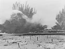 Die Sprengung von Bunkeranlagen auf Helgoland fand am 18. April 1947 um 13 Uhr statt. Die von den Briten als Operation Big Bang oder British Bang bezeichnete Sprengung war mit 6700 Tonnen Sprengstoff, die eine Sprengkraft von circa 3,2 Kilotonnen TNT-Äquivalent entwickelten, die bis dahin größte nicht-atomare, von Menschen gewollt erzeugte Explosion.[1] Das Ziel der Sprengung war, die Bunker- und Militäranlagen der Nordseeinsel Helgoland zu zerstören.[2][3][4] Durch die enorme Menge an Sprengstoff erschien es zudem möglich, die gesamte Insel vollständig zu vernichten, was zwar nicht Ziel der Aktion war, aber in Kauf genommen wurde.[5] Allerdings ließ der poröse Sandstein, aus dem die Insel besteht, die Druckwelle entweichen; somit wurde nur die Südspitze der Insel durch die Sprengung zerstört, an der Nordspitze gab es erhebliche Schäden.