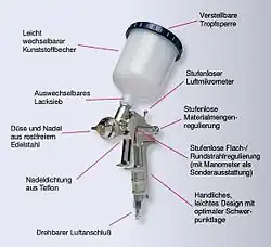 Bei druckluftbetriebenen Spritzpistolen wird der Lack durch die ringförmig um die Düse austretende Luft zerstäubt und auf das Werkstück getragen. Die Farbe gelangt entweder über einen an der Spritzpistole angebrachten Fließ- oder Saugbecher in die Düse oder wird durch einen Schlauch von einem Druckbehälter oder einer Pumpe zugeführt. Durch dieses Verfahren wird der Lackstrahl in sehr feine Tröpfchen zerstäubt, wodurch sich ein sehr gutes Spritzbild ergibt, aber auch viel Farbnebel entsteht.