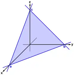 Als Spurdreieck einer Ebene im dreidimensionalen Raum bezeichnet man in der analytischen Geometrie dasjenige Dreieck, das von den Spurgeraden, also von den Schnittgeraden dieser Ebene mit den drei Koordinatenebenen begrenzt wird.[1] Dabei ist die Schnittgerade zweier nicht komplanarer Ebenen als die Menge aller Punkte definiert, die zugleich in beiden Ebenen liegen. Die Ecken des Spurdreiecks liegen auf den Koordinatenachsen, sind also die Spurpunkte der betrachteten Ebene. Das Spurdreieck existiert nur dann, wenn die gegebene Ebene zu keiner der Koordinatenebenen parallel ist.