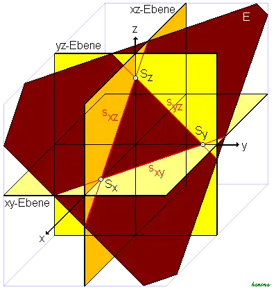Dabei schneidet die Ebene zugleich die Koordinatenachsen in den Spurpunkten Sx, Sy und Sz.