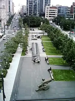 Verschiedene Hochhäuser und auch Wolkenkratzer säumen den Platz. Dazu gehören das Centre de commerce mondial (World Trade Center) an der Nordseite und der Tour de la Bourse, das dritthöchste Gebäude der Stadt, an der Südseite. Im Südwesten befindet sich der Hauptsitz der internationalen Zivilluftfahrtorganisation ICAO, im Osten jener des Medienkonzerns Quebecor.