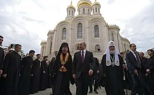 „Am Donnerstag nahm Putin an der Einweihung einer neuen Kirche im Moskauer Sretenskij-Kloster teil. Sie ist den Märtyrern gewidmet, die während der Kirchenverfolgung im Kommunismus getötet wurden. Russland sei ohne die Orthodoxie nicht denkbar, sagte der Präsident. Die Eröffnung der Kirche einhundert Jahre nach den Revolutionen 1917 sei symbolisch. Nur wenn man sich an "die lichten und die tragischen Seiten der Geschichte" erinnere, könne man Lehren aus ihr ziehen.[5]“