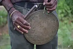 Ein anderer in nordindischen Sprachen verbreiteter Name für diese runden Schlagplatten ist ghari. In Nordindien beträgt ihr Durchmesser etwa 20 Zentimeter bei einer Dicke von 5 bis 10 Millimetern. Ghari werden in der religiösen Musik in Hindutempeln und als Taktgeber in Trommelensembles der Volksmusik zur Tanzbegleitung verwendet. Zur religiösen Verehrung (puja) von Hindus angeschlagen entspricht die runde ghari der ungefähr dreieckigen kyizi der buddhistischen Gläubigen in Myanmar.[8] Bronzeschlagscheiben sind in der buddhistischen Ritualpraxis zwischen Tibet und Japan von Bedeutung. Regionale Bezeichnungen für flache runde Schlagplatten sind ghant in Odisha, jhalar in Rajasthan sowie in Südindien chengila, cennala, jaganta, jagate und semakkalam.[9]