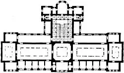 Das 1878 eröffnete Museumsgebäude des Städels wurde nach Plänen des Architekten Oskar Sommer erbaut. Es entstand am südlichen Ufer des Mains, das heute als Museumsufer bekannt ist. Der eigens als Gemäldegalerie errichtete Bau wurde im Stil der Neorenaissance errichtet und erinnert an florentinische Gebäude. Das Städel gilt insofern als Vorläufer des Opernhauses von 1880 und des Hauptbahnhofs.[23] Die Fassade aus Sandstein ist zweireihig gegliedert. Die Fenster des Erdgeschosses sind Bogenfenster, die des Obergeschosses sind komplexer gestaltet und werden durch zwei ionische Säulen getrennt. Der Eingang des Gebäudes wird von zwei Statuen eingerahmt. Die eine zeigt Hans Holbein, die andere Albrecht Dürer. Die historischen Bezüge in der Architektur unterstreichen die Funktion des Gebäudes als „Tempel der Kunst“ und zeigen auch die kulturellen Ambitionen der Stadt Frankfurt auf.[23]