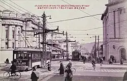 Unabhängig davon begann die Stadt selbst ab 1912 mit dem Aufbau eines normalspurigen Straßenbahnnetzes. Ausgehend vom Hauptbahnhof wurde zunächst ein Innenring über Shichijōdōri–Ōmiyadōri–Kōindōri–Senbondōri–Imadegawadōri–Kawaramachidōri mit zentral kreuzenden Achsen durch die Karasumadōri in Nord-Süd- und die Shijō- und Marutamachidōri in Ost-West-Richtung in Angriff genommen. Das Schmalspurnetz wurde mitsamt den 136 vorhandenen Fahrzeugen 1918 von der Stadt gekauft und daraufhin bis 1927 teilweise umgespurt, teilweise eingestellt; einzig eine Linie vom Hauptbahnhof nach Kitano blieb noch bis 1961 unter der Bezeichnung N-den (N電) in Betrieb.