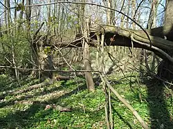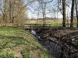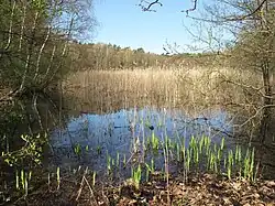 Damit verlandete auch der am Fließ aufgestaute Mühlenteich, der heutige Bauernteich. Seit seiner Austorfung 1984/85 bildet er wieder ein Kleingewässer. Allerdings schritt der Verlandungsprozess durch erneute Rückgänge der Grundwasserstände seit Beginn der 2000er-Jahre wieder voran. 2003 einsetzende Wasserüberleitungen aus dem Mühlenfließ konnten den Prozess wiederum verlangsamen. Der Bauernteich umfasst rund einen Hektar und hat eine maximale Tiefe von 0,5 Metern, im Mittel von 0,3 Metern. Den im Trophiesystem 2008 als eutroph eingestuften Flachsee umgibt ein breiter Röhrichtgürtel.[68] Er bietet einen Lebensraum für Libellen wie die in Brandenburg gefährdete Kleine Binsenjungfer, Glänzende Binsenjungfer und Keilfleck-Mosaikjungfer (beide auf der Vorwarnstufe), für Amphibien oder Heuschrecken wie Sumpfschrecke (Vorwarnstufe) oder Kurzflüglige Schwertschrecke und weitere Tier- und Pflanzenarten. Das ehemalige Sumpfgebiet um den Bauernteich ist von Erlenbrüchen durchsetzt und bildet die Südspitze des ältesten Naturschutzgebietes in der Nuthe-Nieplitz-Niederung.