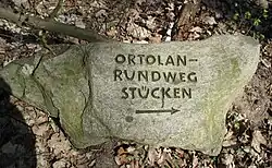 Der für den Rundweg namensgebende Ortolan aus der Familie der Ammern wird in der Roten Liste Brandenburg als gefährdet eingestuft. Der Bestand des Zugvogels wurde in Brandenburg 2006 auf rund 2800 bis 3000 Paare geschätzt, davon entfielen 152 auf den Naturpark Nuthe-Nieplitz. Insbesondere die Waldränder, Hecken und extensiv genutzten Getreidefelder am Ortolan-Rundweg bilden ein bedeutsames Reproduktionsgebiet der Ammer und bieten dem durch fortschreitende Biotopzerstörung und Veränderung der Anbaumethoden bedrohten Vogel seinen bevorzugten Lebensraum trockenwarmer Standorte und offener Flächen mit vereinzelten Büschen zur Deckung. Bemerkenswert ist, dass sich am Feldweg zwischen dem Weinberg und Stücken zwei Dialektpopulationen des für seinen regionaltypischen Gesang bekannten Singvogels (ungefähr „zri-zri-zri-zri-djü-djü-djü“ oder „ridri-dri-dri-jööj“) mischen. Südlich des Wegs ist eher die Dialektpopulation des Flämings, nördlich die der Lausitz vertreten.[66] Geübte Ornithologen sind in der Lage, die Herkunft beziehungsweise den Aufwuchsort eines Ortolans an seinem regionaltypischen Gesang zu erkennen.