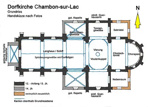Der romanische Bauabschnitt besitzt den klassischen Grundriss in Form eines lateinischen Kreuzes, aus einem einschiffigenen Langhaus, einem Querhaus, mit ausgeschiedener Vierung und zwei Querhausarmen einem Chorjoch mit halbrunder Chorapsis.