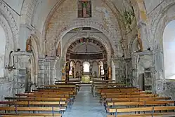 Das einschiffige Langhaus ist drei im Grundriss rechteckige Joche lang und wird von Spitzbogengewölben überdeckt, die von zwei kräftigen, spitzen Gurtbögen getrennt sind. Unmittelbar vor der Vierungswand gibt es noch einen vierten, etwas schmaleren Gurtbogen. Die Gurtbögen werden an ihren unteren Enden knapp 1,50 Meter senkrecht nach unten verlängert (gestelzt). Die Bogenenden werden von auf der Innenseite profilierten Kämpfern markiert. Nur unter dem Kämpfer in der Ecke zwischen Vierungswand und Südwand des Schiffs gibt es einen kapitellartigen Wulst. Die senkrechten Gurtstücke stehen auf gut zwei Meter langen, halbrunden Säulenschäften, die wuchtige pflanzlich skulptierte Kapitelle tragen, die mit kräftigen Kämpferplatten abgedeckt und deren untere Sichtkanten abgeschrägt sind. In den Ecken zwischen Vierungswand und den Seitenwänden des Schiffs steht, statt der Säule mit Kapitell, eine im Querschnitt fast quadratische Wandvorlage mit einer Kämpferplattenabdeckung. In den Ecken zwischen der Westwand und den Seitenwänden gibt es ebenfalls solche Wandvorlagen mit Kämpfern, jedoch ohne Untergurte.