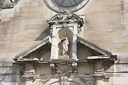 Der Chor ist von hohen Maßwerkfenstern durchbrochen. Er wird von Strebepfeilern gegliedert, die mit Krabben und Fabelwesen verziert sind. Die Ädikula im gesprengten Giebel über dem Portal der Westfassade enthält eine Skulptur des Schutzpatrons der Kirche, der eine Säge als Zeichen seines Martyriums in der Hand hält. An der Nordseite des Schiffs, das nicht die Höhe des Chors erreicht, erhebt sich der massige, quadratische Glockenturm, der nicht vollendet wurde. Er besitzt eine Glocke, auf der das Wappen und die Devise von Anne de Montmorency eingraviert sind. Sie wurde 1554 gegossen, wiegt 1300 Kilogramm und ist eine der ältesten Glocken des Départements.