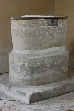 Das romanische Taufbecken aus dem 12. Jahrhundert ist mit floralem Schmuck verziert.