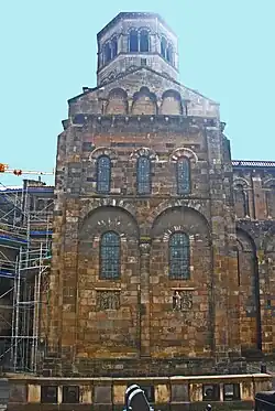 In den Ostwänden der Querschiffarme hat man je einen halbrunden Kapellenapsis mit Kalotteneinwölbung untergebracht, die südliche ist vermutlich eine Rekonstruktion des 19. Jahrhunderts. Ihre Öffnungen zu den Querhausarmen werden jeweils flankiert von Säulen in Wandrücksprüngen, mit skulptierten Kapitellen und profilierten Kämpfern und Basen. In den Apsiswänden ist je ein kleines rundbogiges Fenster ausgespart. Sie werden von Arkadenbögen überdeckt, die von schlanken Säulchen getragen werden, mit der sonst üblichen Ausstattung. Sie stehen auf einem Sockel, der um die ganze Apsis herumgeführt ist. Die Ostwände der Querhausarme sind mit zwei Fenstern ausgestattet, in Form, Größe und Höhenlage der oberen Fenster auf den Giebelwänden.