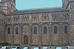 Die Gliederung der Chorapsis wird in zwei horizontale Abschnitte unterteilt und zwar getrennt durch ein Kragprofil mit dem bekannten Rollenfries. Im unteren Abschnitt dominieren fünf rundbogige Fenster, deren Bogensteine von doppelten Kragprofilen überfangen werden, die in Höhe der Bogenansätze waagerecht abknicken und bis zum nächsten Fenster weitergeführt werden. Zwischen dem unteren und oberen Kragprofil verbleiben seltsame rechteckige Nischen, die von drei Säulchen mit skulptierten Kapitellen und profilierten Basen unterteilt werden, die unmittelbar das obere Kraggesims tragen. Dieses Motiv ist eine Anleihe aus der römischen Antike. Außerhalb der Hauptkirchen trifft man das Motiv nur noch einmal an der nicht weit entfernten, runden Friedhofskapelle von Chambon-sur-Lac an.