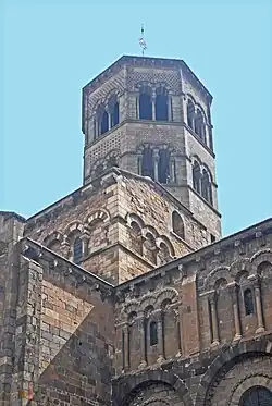 Dieses Gebilde wird massif barlong genannt, welches zusammen mit der Vierungskuppel den hoch aufragenden Glockenturm trägt und abstützt. Es findet sich bei allen Hauptkirchen der Basse Auvergne. Um diesem wuchtigen Unterbau die Schwere zu nehmen, wurden seine Wände und die darin befindlichen Fenster, auch auf der Ostseite, und dort über die Vierung hinweg, mit teils durchlaufenden Arkaturen bestückt, von denen einige Arkaden kleinere Fenster enthalten. Ihre Bögen werden von Säulchen getragen, ähnlich denen der Seitenwände des Langhauses. Auf der westlichen Seite gibt es nur über den Seitenschiffen je eine Zwillingsblendarkade. Der Mittelteil wird dort vom oberen Teil des Langhaussatteldachs verdeckt. Die Arkaturen des massif barlong werden über ihren Bogensteinen und unterhalb von Kragprofilen mit dem Kraggesims mit Rollenfries, wie die bei den Langhausfenstern, begleitet und untereinander waagerecht verbunden und um das ganze Gebilde herumgeführt. Auf der Ost- und Westseite ist oberhalb der Arkaturen auf beiden Seiten in Turmnähe je eine rundbogige Mauernische ausgespart, mit halbrundem Grundriss. Auf der Ostseite sind zwischen diesen Nischen Inkrustationen angebracht, die aus dreieckigen Mosaikplatten, die untereinander und außen herum von schmalen Streifen getrennt und eingefasst werden. Die nördlich und südlich über den Turm hinausreichenden Teile des massif barlong sind oberseitig mit flach nach außen geneigten Pultdächern überdeckt, die wie das Langhausdach eingedeckt sind. Die Traufausbildung ähnelt der des Langhauses, kragt jedoch nicht so weit aus. Das Regenwasser tropft auch hier frei ab, aber auf die Dächer darunter. Über den vorgenannten Nischen sieht man kurze Abschnitte von Traufausbildungen. Sie gehören zu kleinen dreieckigen Pultdachflächen, die über den Ecken der quadratischen Vierung entstanden sind.