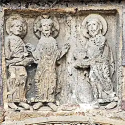Unmittelbar über dem Nordportal ist ein rechteckiges Relief eingelassen, auf dem drei stehende Personen dargestellt sind, die mittlere mit einem Kreuznimbus ist Jesus, die äußeren mit Nimben sind vermutlich zwei seiner Jünger. Der linke hält zwei Fische in den Händen, der rechte ein kreisrundes Gebilde, vermutlich ein Brot. Jesus spricht mit ausgebreiteten Armen, mit der Rechten erteilt er den Segensgestus. Bei dieser Szene handelt es sich offensichtlich um „Die erste wunderbare Brotvermehrung“ (Joh. 6, 2-14; Luk. 9, 11-17; Mark. 6, 33-46; Matth. 14, 13-23).