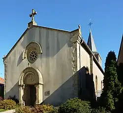 Der Chorturm mit anschließender Halbkreisapsis stammt aus dem 13. Jahrhundert. Die Apsis selber ist von Strebepfeilern umgeben. Der Turm wurde im Rahmen des Neubaus des Kirchenschiffes im 19. Jahrhundert erhöht. Im Westen erhielt die Kirche eine repräsentative neuromanische Fassade mit Rosettenfenster und einem Portal mit Tympanon.