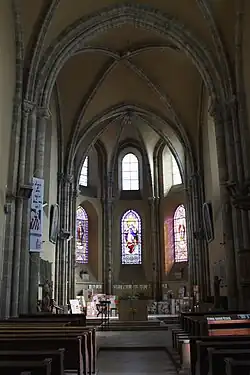 Das einschiffige Langhaus ist in drei quadratische Joche gegliedert und mit einem Kreuzrippengewölbe gedeckt. Der Chor, der wie das Südportal in das späte 12. Jahrhundert datiert wird, ist halbrund geschlossen. Er wird von sechs spitzbogigen Fenstern beleuchtet, die in zwei Reihen übereinander angeordnet sind.